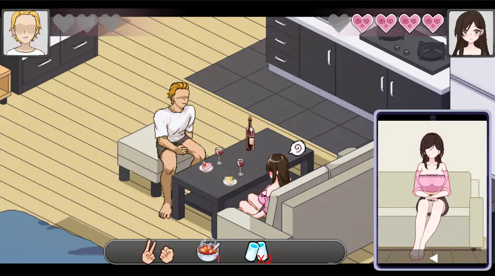 游戏每天分为早上、下午、晚上、午夜四个时段,每个时段可选择不同行动,如打工赚钱、与女主角互动、购买道具等。